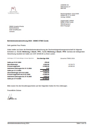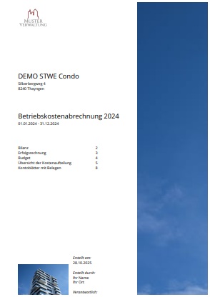 Klicken Sie unten um die Beispieldokumente anzuschauen. Bei den Abrechnungen können Abschnitte nach Bedarf hinzugefügt oder weggelassen werden.
